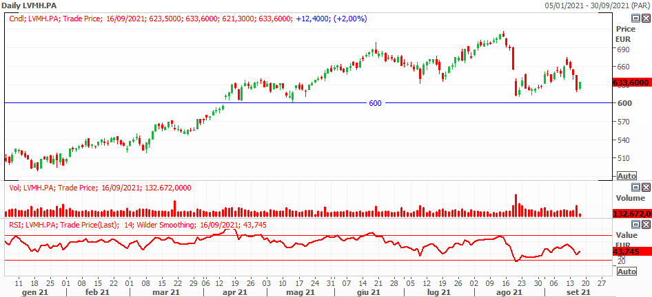 Newsflow. Prove di rimbalzo per LVMH oggi dopo il crollo delle ultime sedute. Il quadro rimane ancora però debole per il settore. Da uno dei mercati di sbocco principali per le società del settore, quello asiatico, in primis la Cina, il news flow infatti non è per niente positivo. Le chiusure per contrastare i focolai pandemici stanno avendo impatto anche a livello macroeconomico. Ultimo il focolaio di variante Delta che ha spinto le autorità cinesi a decidere per un lockdown nelle città di Putian e Xiamen, nella provincia di Fujian, nella parte sudorientale del paese. Una dinamica che si riflette anche sui dati macroeconomici. I dati pubblicati dall'Ufficio Nazionale di Statistica infatti mostrano che le azioni di contenimento del contagio frenano l'espansione in modo pesante, soprattutto per quel che riguarda i consumi. Le vendite al dettaglio, in agosto sono salite del 2,5% anno su anno, un forte ridimensionamento dal +8,5% di luglio: il consensus si aspettava +7%. Sotto le attese anche la produzione industriale: +5,3%, dal +6,4% di luglio. A tutto ciò si aggiungono anche le tensioni geopolitiche legate al lancio di nuovi missili da parte della Corea del Nord.