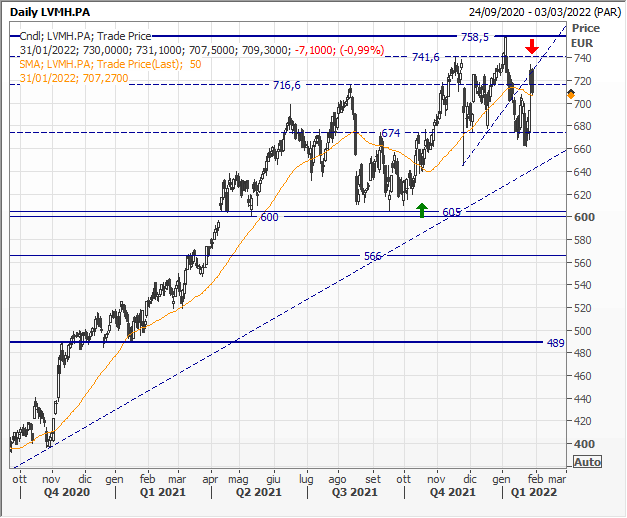 Newsflow. I conti del quarto trimestre 2021 hanno sorpreso al rialzo un consenso già positivo: il target medo di consenso Bloomberg sale così a 815 euro. Tuttavia, le tensioni geopolitiche e gli switch di portafoglio da settori tech/lusso/growth (titoli dai multipli alti) a settori value dovrebbero proseguire, calmierando eventuali spinte rialziste di LVMH.