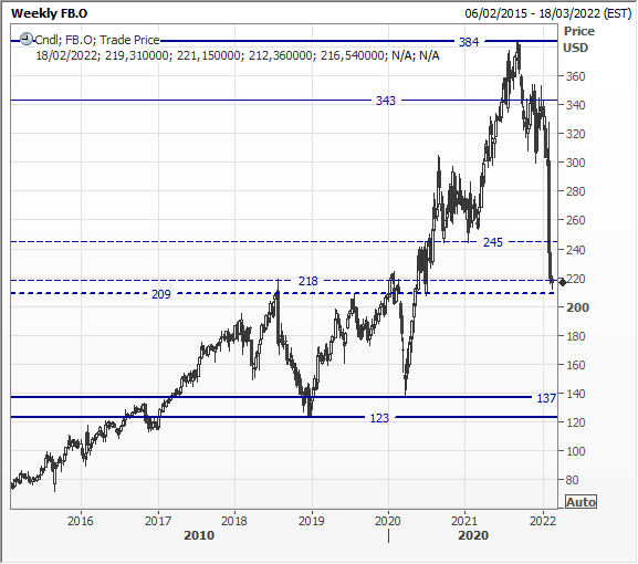 Scenario grafico di breve-medio periodo. Meta Platforms, ora nel pre-market a 215 usd, -0,7%, ha quasi dimezzato il suo valore dai record a 384 usd segnati lo scorso settembre. L'area raggiunta è sicuramente un supporto degno di nota e potrebbe favorire un rimbalzo, magari anche deciso, ma crediamo che il ribasso non sia finito. Rimane alto il rischio di ulteriori approfondimenti fin verso 150-120 usd.