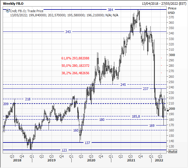 Scenario grafico di breve-medio periodo. Meta Platforms, ora a 198 usd (-1%) nel pre-market. Dai record a 384 usd dello scorso settembre ai minimi di aprile a 169 usd ha più che dimezzato la capitalizzazione. Le 2 reazioni viste finora non sono riuscite a superare le prime resistenze degne di nota a 220/240 usd. Questo rafforza la nostra idea ribassista sul titolo con possibili/probabili ulteriori approfondimenti fin verso 150-120 usd.