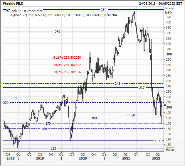 Scenario grafico di breve-medio periodo. Meta Platforms, ora a 198 usd (-2,8%) nel pre-market. Dai record a 384 usd dello scorso settembre ai minimi di aprile a 169 usd ha più che dimezzato la capitalizzazione. Le 2 reazioni viste finora non sono riuscite a superare le prime resistenze degne di nota a 220/240 usd. Questo rafforza la nostra idea ribassista sul titolo con possibili/probabili ulteriori approfondimenti fin verso 150-120 usd.