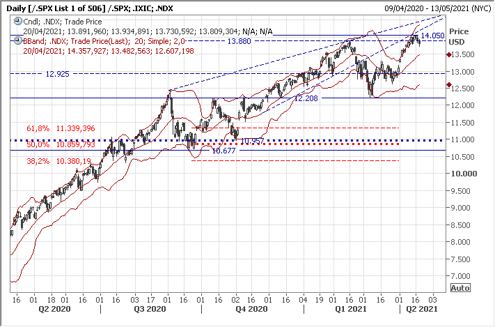 Scenario grafico di breve-medio periodo. Nasdaq 100, ora a 13.780 punti -0,2%. Il Nasdaq soffre l'area dei massimi assoluti segnati lo scorso febbraio a 14.175 punti. Il Nasdaq 100 è invece riuscito a segnare nuovi record assoluti questo mese, anche se marginali. Aumentano le chances di assistere ad un ritracciamento che potrebbe far rivedere area 13.000/12.600 punti.