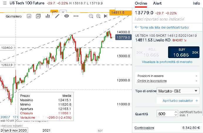 TRADING Turbo24 - SHORT su US TECH 100 con Knock Out a 14.811,53 punti
