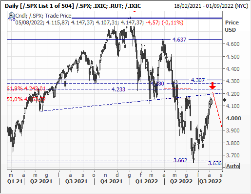 Scenario grafico di breve-medio periodo. S&P500, ora a 4.141 usd (-0,3%). Dopo aver perso il 25% dai top assoluti di gennaio a 4.818 usd ai minimi di giugno a 3.636 usd, ha avviato un energico rimbalzo che però si trova ad affrontare barriere grafiche molto forti da qui a 4.300 usd. Questo è lo spartiacque da superare per ambire nuovamente ai top.