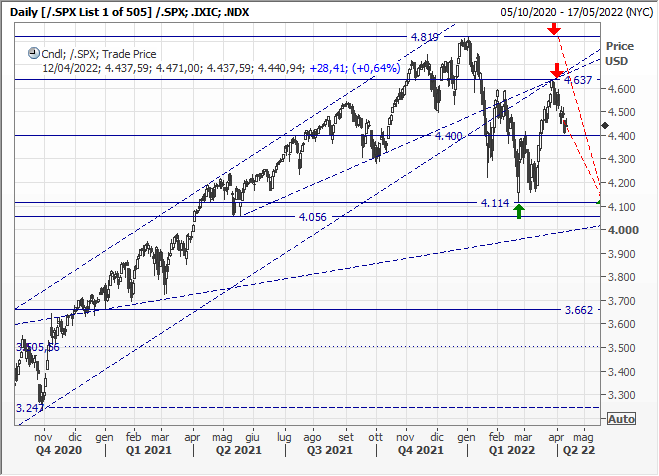 Scenario grafico di breve-medio periodo. S&P500, ora a 4.490 usd (-0,3%). Dopo aver perso quasi il 15% dai top assoluti di gennaio a 4.818 usd, ha rimbalzato di quasi il 13% dai minimi di febbraio a 4.114 usd. I prezzi però sono stati respinti dalle resistenze statiche e soprattutto dinamiche, parte bassa del canale indicato nel grafico. Cresce così il rischio di un ritorno sui precedenti minimi con difese intermedie in zona 4.400/4.300 usd.