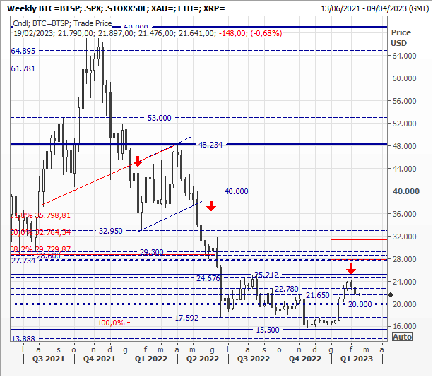 Operatività multiday: a questi prezzi, e soprattutto su eventuali spunti verso le resistenze in zona 24.000/25.000 usd, suggeriamo posizioni scalettate SHORT sul BITCOIN con Knock Out a 25.953,65 usd, fattore di leva 5x, con il certificato disponibile sulla piattaforma IG.
