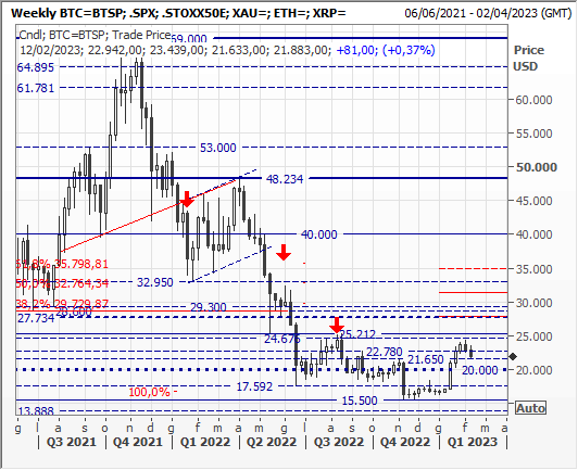 Operatività multiday: a questi prezzi, e soprattutto su eventuali spunti verso le resistenze in zona 24.000/25.000 usd, suggeriamo posizioni scalettate SHORT sul BITCOIN con Knock Out a 25.964,32 usd, fattore di leva 5x, con il certificato disponibile sulla piattaforma IG.
