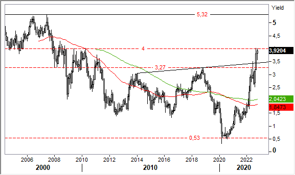 Graficamente, dal grafico seguente emerge in modo chiaro la rapida risalita dei rendimenti del Treasury Note 10 anni, passati in pochi mesi da 0,50% (area del minimo storico) al 4,0% in accompagnamento della persistente crescita dell'inflazione USA, arrivata ai massimi da quarant'anni.