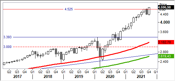 Il quadro grafico dell'S&P500 si conferma saldamente rialzista e non presenta alcun segnale di inversione, anche se evidentemente si è legittimati a pensare che una salita costante e prolungata possa dare luogo a qualche brusca correzione. Dopo una brevissima fase di assestamento nel ristretto range 3.700/3.945 punti, l'uptrend è ripartito in maniera vigorosa andando a sfondare con convinzione la soglia psicologica dei 4mila punti.