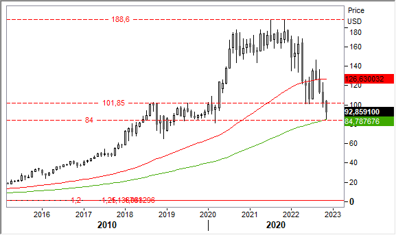 La violenta discesa successiva ha portato negli ultimi giorni a sfondare anche la fortissima soglia discriminante in area 101,85/100 usd, fornendo un ulteriore segnale di debolezza. L'obiettivo finale del ribasso, indicato nei precedenti commenti in area 84 usd, è stato centrato proprio ieri prima del forte rimbalzo in corso.