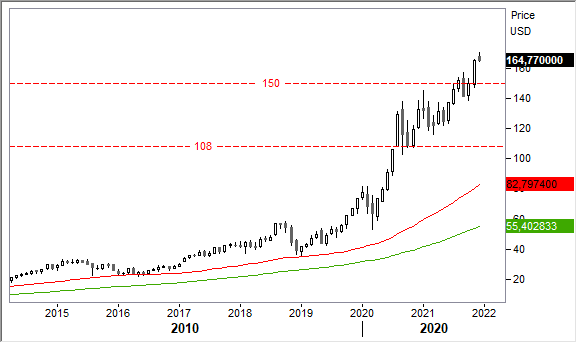 Graficamente, la tendenza di lungo termine è strutturalmente rialzista. La rottura decisa dell'area dei precedenti massimi storici verso 150 usd ha dato nuovo impulso all'uptrend aprendo strade inesplorate.