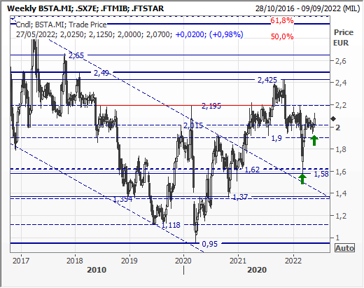 Da lì è partita la fase ricostruttiva che stiamo vedendo da diversi trimestri. La spinta ha fatto uscire i prezzi dal pluriennale canale ribassista, rivedendo seppur temporaneamente valori pre-pandemia (2,425 euro), area spartiacque per ambire a rialzi ben più ambiziosi: 2,5-3 euro. Il recente ritracciamento dovrebbe fermarsi e invertire nuovamente al rialzo da quest'area, zona 2 euro: la reazione di ieri/oggi è di buon auspicio.