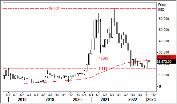 Analisi Tecnica Bitcoin. Il quadro grafico resta profondamente ribassista. Il forte rimbalzo di Gennaio rientra ancora nello scenario di un semplice aggiustamento da ipervenduto. Segnali di inversione arriverebbero solo con la risalita stabile oltre quota 26mila usd. Al momento, perciò, non si può ancora escludere l'ipotesi di un ritorno sui minimi dell'anno scorso a 15.500 usd.