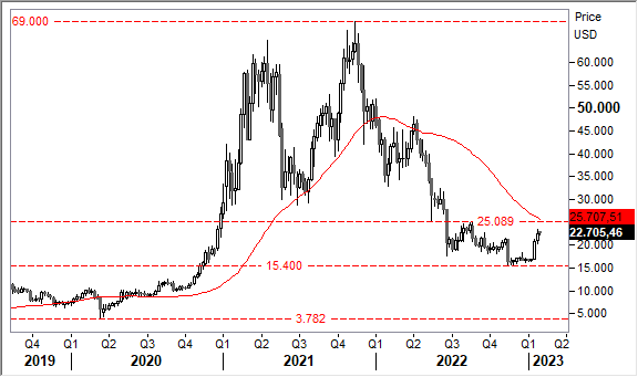 Analisi Tecnica Bitcoin. Il quadro grafico resta profondamente ribassista. Il forte rimbalzo di inizio anno rientra nello scenario di un semplice aggiustamento da ipervenduto. Segnali di inversione arriverebbero solo con la risalita oltre quota 26mila usd. Al momento, perciò, non si può ancora escludere l'ipotesi di un ritorno sui minimi dell'anno scorso a 15.400 usd.