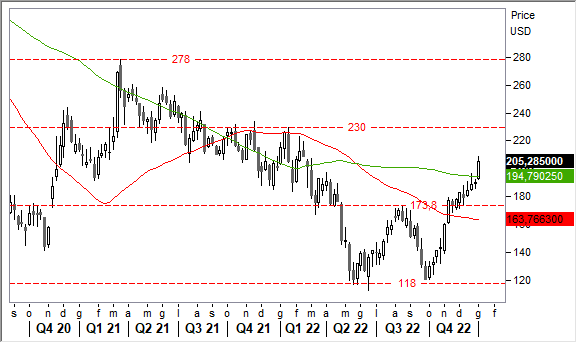 Il recente superamento di area 173,80 usd ha completato una figura di doppio minimo con target naturale in area 230 usd. Ma l'obiettivo finale del movimento in corso potrebbe essere più ambizioso, ovvero verso 278 usd.
