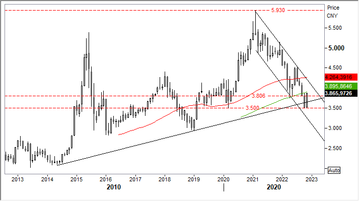 Analisi tecnica Borsa. L'impostazione di breve dell'indice CSI 300 (3.865) è in fase correttiva a partire dai top di inizio 2021. Il primo forte sostegno statico in area 3.500 ha avviato una importante reazione, che proprio oggi manifesta i primi timidi segnali di inversione del downtrend con l'attacco alle resistenza in area 3.800/3.900 punti (parte alta della candela ribassista di ottobre/media mobile indicata in verde nel grafico).