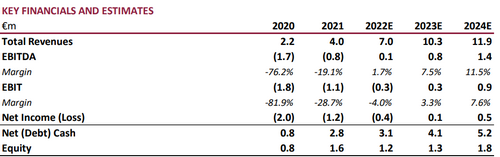 Per il 2022, Envent stima ricavi pari a 7 milioni di euro, che dovrebbero raggiungere i 10,3 milioni nel 2023 e i 11,9 milioni nel 2024.