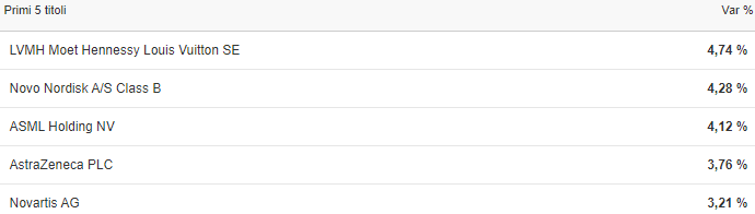 Punta a replicare (benchmark) l'indice STOXX Europe Paris Aligned Climate la cui composizione vede ai primi cinque posti le seguenti azioni. Non distribuisce dividendi. Valuta di denominazione Euro. Leggi il documento KID.