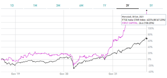 Il grafico sottostante riporta la performance a 3 anni del titolo First Capital a confronto con l’indice FTSE Italia STAR (+158% vs +67%).