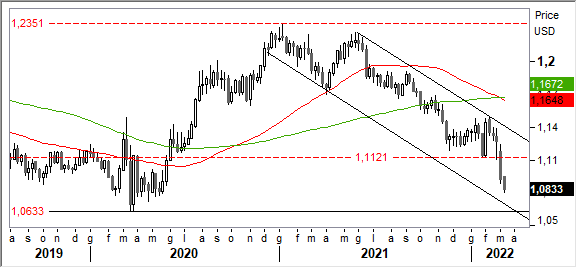 Analisi Tecnica. L'evoluzione drammatica del quadro geopolitico ha riportato in auge la prerogativa di bene rifugio del Dollaro USA, facendo passare in netto secondo piano il tema dell'inflazione. Saltato il primo supporto in area 1,112, posizionato sui precedenti minimi dell'anno, la strada in direzione dei minimi del 2019 in area 1,06 è aperta.