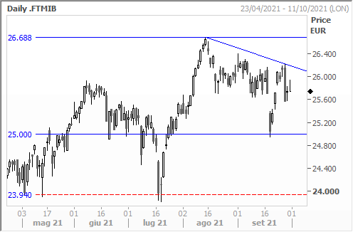 Operatività. Manteniamo una visione positiva. Comprare a mercato e incrementare alla prima chiusura sopra 26mila per target finale intorno a 32mila punti. Sfruttare eventuali pull back fin verso 25mila per acquisti sulla debolezza. Applicare uno stop prudenziale sotto 24mila punti.
