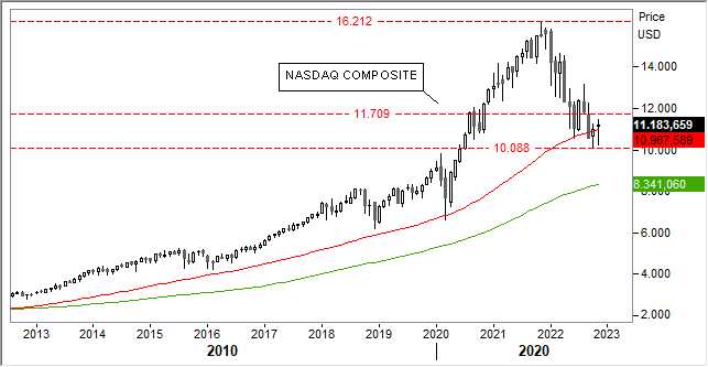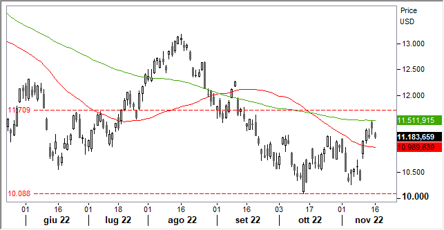 Al momento, invece, sul quadro di breve (secondo grafico) non sono ancora visibili segnali di inversione del downtrend avviato dal picco record di fine 2021 a 16.212 punti. Occorrerà anzitutto violare le forti resistenze posizionate nel range 11.515 (media mobile a 100 giorni) - 11.709 (limite superiore della candela nera mensile di settembre). In caso di successo, l'obiettivo grafico dovrebbe essere intorno ai 13mila punti.