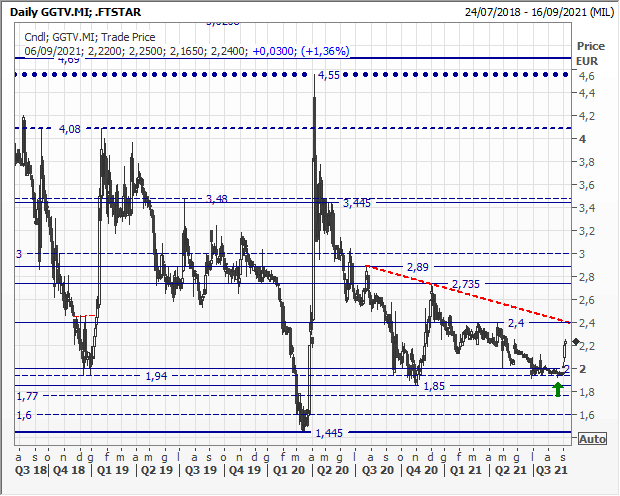 Premettiamo che la serie storica dei prezzi parte solo dal 2015 (anno della quotazione) e questo limita un pò le potenzialità previsive dell'analisi tecnica sugli scenari futuri di medio-lungo termine. Graficamente, dopo il primo anno passato in trading range, 1,6-2,4 euro, i prezzi hanno messo a segno un poderoso rialzo fino al massimo assoluto segnato a 8,90 euro. Poi è prevalso il ribasso fino ai minimi assoluti segnati nel 2020 a 1,4450 euro (causa pandemia), con successivo decollo fino a 4,55 euro, guadagno durato poco vista la successiva ricaduta sui forti supporti in zona 2/1,8 euro.