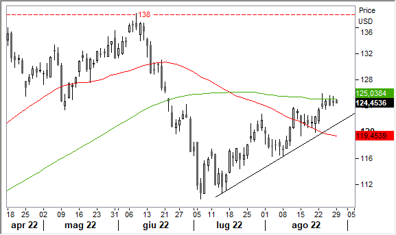 Operatività. Sfruttiamo allunghi verso 126 punti per prendere profitto in ottica di trading. Correzioni verso area 120/119 sono occasioni da sfruttare per acquisti sulla debolezza. Una chiusura sopra 127 punti farà scattare nuovi ingressi Long per target finale verso 140 punti.
