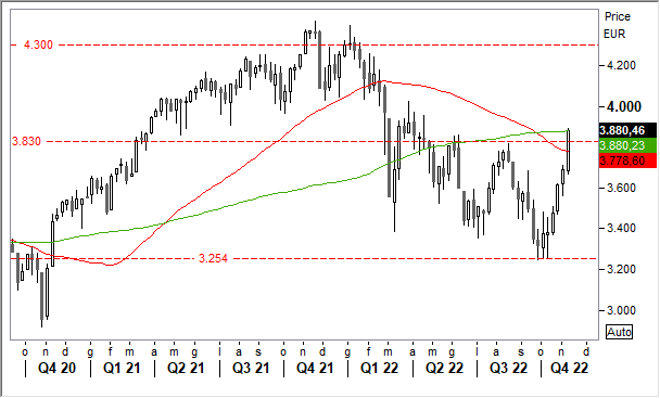 Analisi tecnica. L'indice Eurostoxx 50 resta impostato al rialzo sul quadro di lungo periodo. Il brillante rimbalzo avviato dai minimi degli ultimi due anni, toccato a cavallo tra settembre e ottobre, ha spinto l'indice a ridosso della prima forte resistenza in area 3.880/3.900 punti.