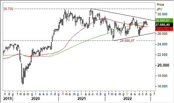 L'impostazione di lungo periodo è saldamente rialzista, con il picco record segnato nel febbraio 2021 intorno a 30.700 punti e rivisto nel settembre 2021. Fortissimo supporto statico in area 24.700/24.500 punti.