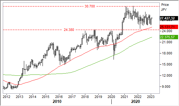 Operatività. Confermiamo la visione positiva di lungo periodo sulla borsa giapponese. Sfruttare le discese in area 27/25mila per accumulare in vista di un probabile ritorno sui top assoluti.