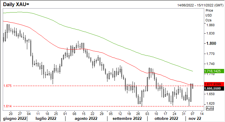 Si guarda ora ai dati sull'inflazione negli Stati Uniti di ottobre, che dovrebbero mostrare una persistenza della pressione al rialzo dei prezzi, vicino ai massimi degli ultimi 40 anni. È pensabile che una lettura in questi termini provocherà un nuovo arretramento dell'oro.