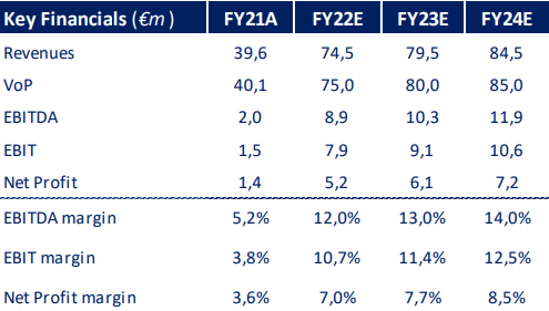Gli analisti vedono, per il 2022, ricavi pari a 74,5 milioni di euro, un Ebitda pari a 8,9 milioni di euro, e profitti netti pari a 5,2 milioni di euro.