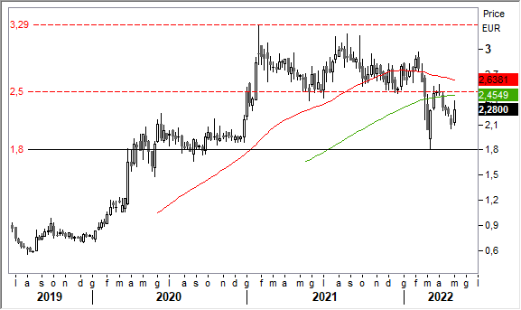 Graficamente, si nota che l'uptrend costruito dai minimi assoluti a 0,55 euro (grafico rettificato) ha alternato momenti di spinta a fasi di riaccumulo. Dal picco record del 2021 il trend è entrato in una fase laterale con un livello inferiore a 2,50 euro, il cui cedimento, avvenuto a inizio 2022, ha provocato la discesa successiva verso area 1,80 euro. Rinnovati segnali si spinta saranno visibili con la ripresa stabile di area 2,50 euro.