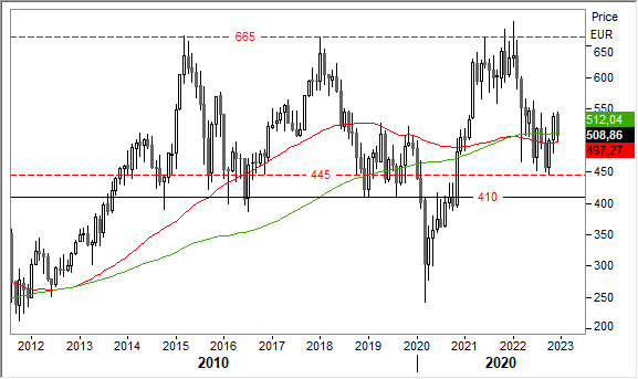 Operatività. Approfittare delle eventuali correzioni/pull back verso la parte bassa del range (445/410) per impostare acquisti sulla debolezza. La prima chiusura sopra 520 punti farà scattare acquisti in tendenza con obiettivi verso 650 punti. Stop loss sotto 400 punti.