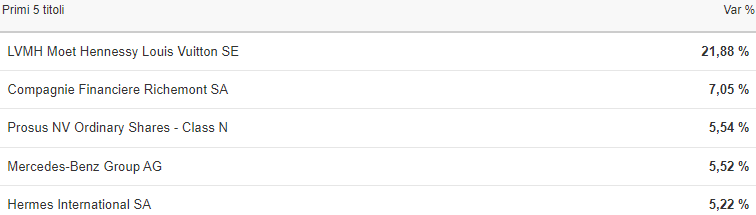 Obiettivo dell'ETF è la replica dell'indice MSCI Europe Consumer Discretionary. Questo indice rappresenta tutte le azioni europee che appartengono al settore dei "beni di consumo discrezionali" (esclusi gli Alimentari). Commissioni totali annue 0,30%. Non distribuisce dividendo. Nella tabella di seguito i primi cinque titoli. Leggi il documento KID.