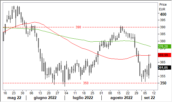Operatività. Manteniamo una visione positiva sul settore, anche in virtù della elevata remunerazione sotto il profilo dei dividendi (le stime di bloomberg indicano un 4,80% medio a livello europeo). Si suggerisce di comprare ai livelli attuali, sfruttando eventuali discese fin verso area 340 punti. Incrementare la posizione alla prima chiusura sopra 370 punti. Stop loss prudenziale in caso di discesa sotto 335 punti.