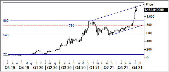 Operatività multiday. Sfruttiamo lo strappo di questi giorni per prendere profitto in ottica di trading. Si suggerisce di attendere un calo della volatilità (assestamento) o un pull back nell'area dei 1.000/900 usd per rientrare sulla debolezza.