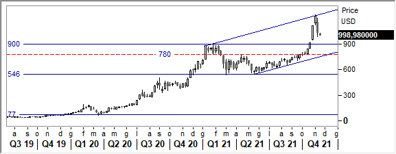 Operatività multiday. Abbiamo sfruttato gli strappi verso i top assoluti per prendere profitto in ottica di trading. Si suggerisce di rientrare in acquisto sulla debolezza in due step: il primo in area 1.000 usd, il secondo in caso di estensioni del ribasso in area 900 usd.