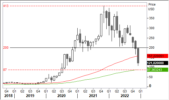 Analisi Tecnica. Graficamente, la fase correttiva avviata dai top assoluti non si è ancora esaurita. La violazione al ribasso di area 158/156 usd, dove transita una prima importante media mobile di lungo periodo, ha rappresentato un altro duro colpo alle potenzialità di recupero. Il titolo non è riuscito a ricucire in tempi rapidi lo strappo ed è perciò aumentato il rischio di assistere a scivoloni anche fino a 87,0 usd, dove transita una seconda importante media mobile di lungo periodo.