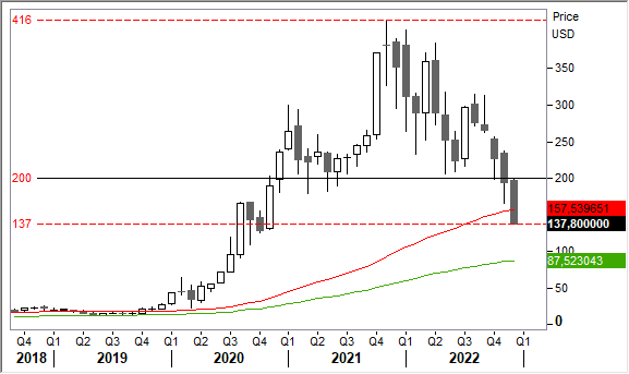 Analisi Tecnica. Graficamente, è in corso una prolungata fase correttiva, avviata dopo l'impressionante cavalcata partita con lo scoppio della pandemia nel marzo 2020. Il cedimento di area 200 usd ha aperto la strada a ulteriori discese, che si sono puntualmente verificate.