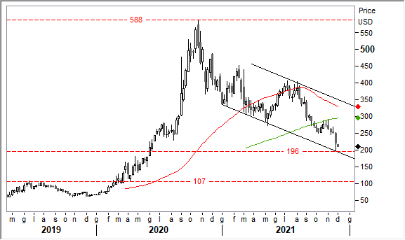 Da quel livello è partita la correzione tuttora in corso che ha più che dimezzato la quotazione in un anno. Al ribasso il primo importante supporto degno di nota è in area 200 usd, a ridosso della parte bassa del canale decrescente evidenziato nell'immagine. Il cedimento di questo livello proietterebbe obiettivi intorno a 107 usd.